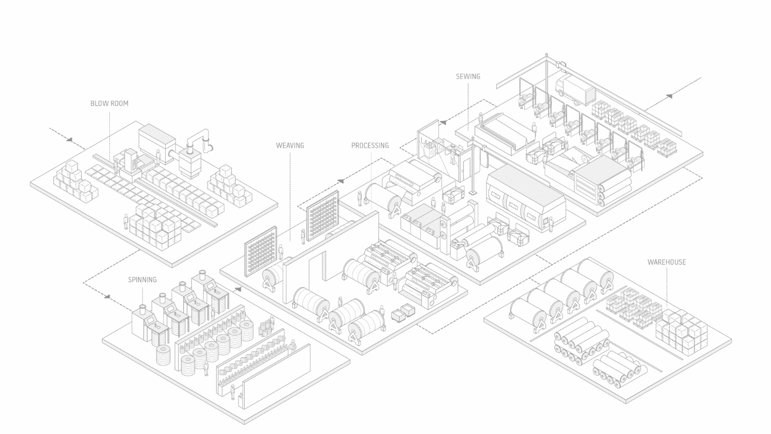 In the blowroom we receive large bales with raw cotton fibres. Here, our high-tech setup picks layers of cotton from eachother and distributes it into the blending and cleaning machines to ensure evenly blended and clean cotton ready to be spun into yarns.